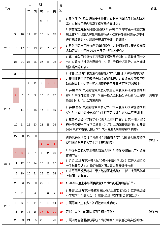 永城职业学院2025-2026-02学期共青团工作行事历